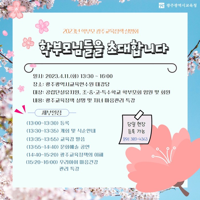 5일 시교육청에 따르면 이번 설명회는 각급 학교 학부모회 임원뿐 아니라 광주교육에 관심 있는 학부모라면 누구나 참석할 수 있다. 이는 코로나 팬데믹 이후 3년 만에 갖는 대면 설명회로 학부모들의 관심이 매우 뜨거웠다. 사전 신청 결과 총 600여 명의 학부모가 참석을 희망했다. 11일 당일 현장 등록을 통해 참석도 가능하다.