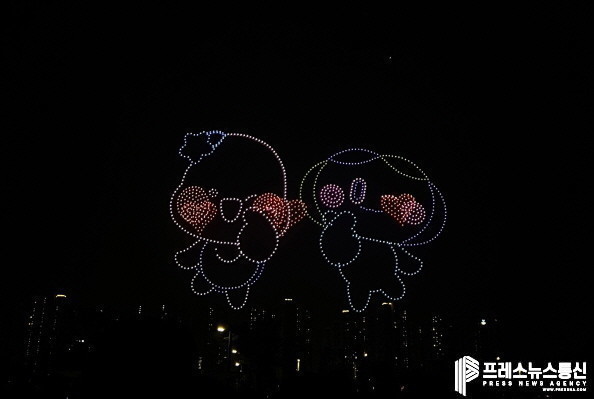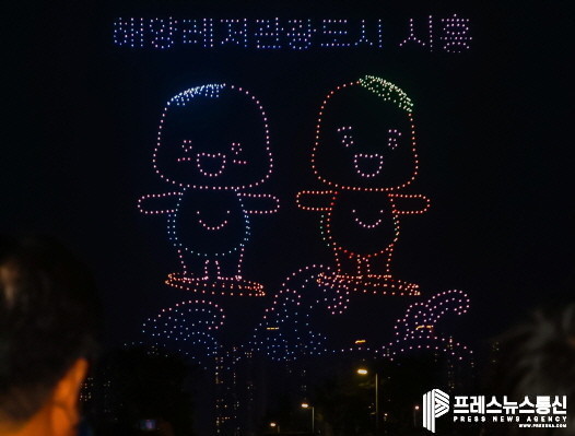 | ▲드론라이트로 연출한 시흥시 캐릭터 해로와 경기도 캐릭터 봉공이(사진=시흥시) |