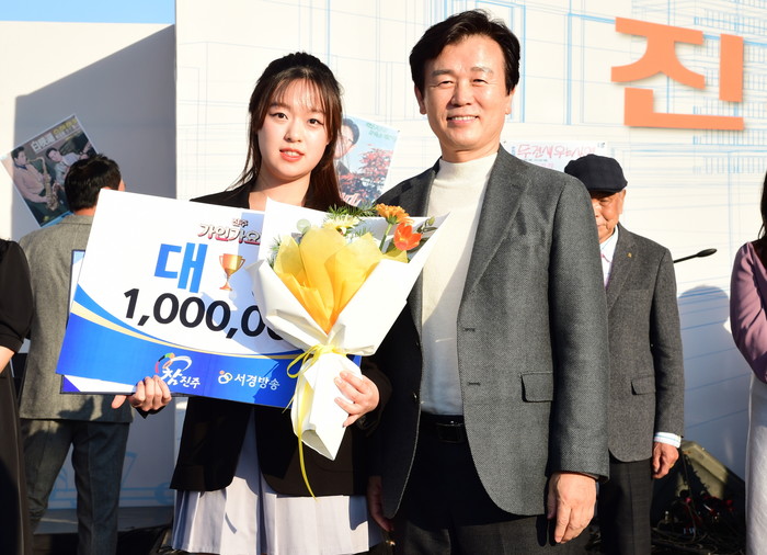 ▲ 2022 진주가인가요제, 대상 수상자 채수현(왼쪽) 씨와 조규일 진주시장(오른쪽)의 기념촬영(사진=진주시) |