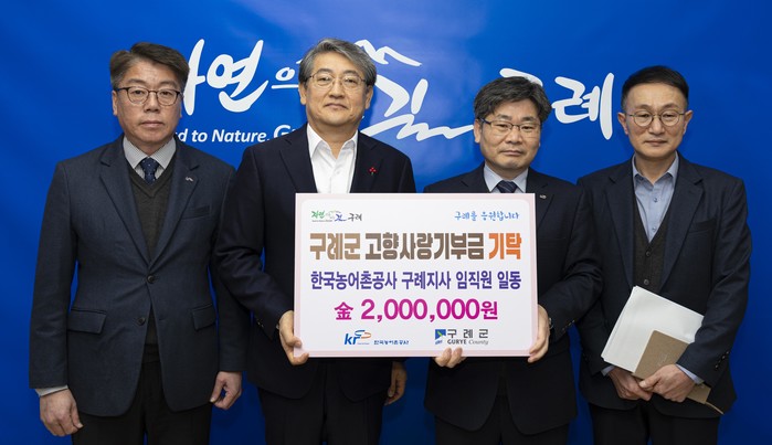 김순호 구례군수는 “고향사랑기부제에 동참해 주신 한국농어촌공사 구례지사 임직원분들께 진심으로 감사드린다.”라며, “임직원분들의 구례에 대한 사랑과 응원이 군민들에게 잘 전달되도록 하겠다.”라고 화답했다.