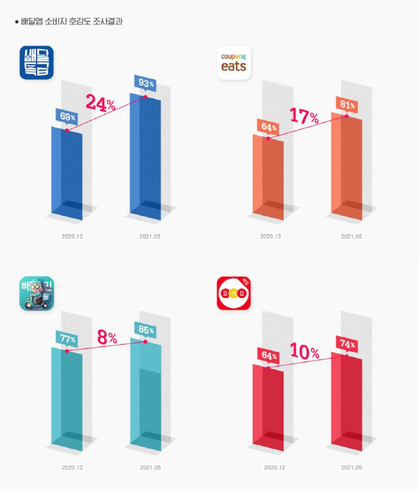 차이커뮤니케이션은 이번 배달특급의 호감도 상승 1위 원인을 “코로나19 장기화로 배달에 대한 호감이 전반적으로 상승한 데다 과도한 수수료와 독과점 이슈에 따라 공공배달앱에 대한 호감도가 올라간 것으로 풀이된다”고 분석했다.