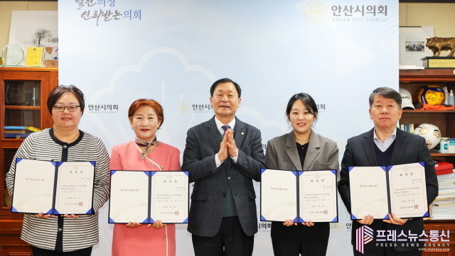 시의회는 17일 의장실에서 박태순 의장과 신임 소식지 편집위원들이 참석한 가운데 수여식을 개최하고 현옥순 의회 의회운영위원회 부위원장과 장기준 투데이안산 대표, 우인경 이동 지역사회보장협의체 위원, 이은빈 의회 입법지원팀 정책지원관 등 4명을 소식지 편집위원으로 위촉했다.