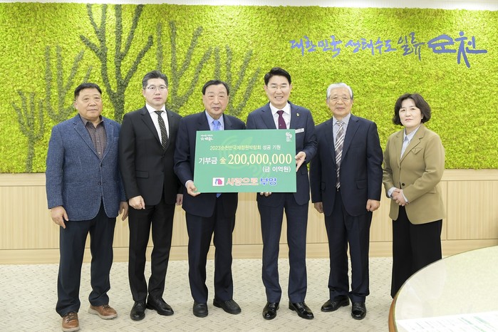 (재)순천만국제정원박람회조직위원회(이사장 노관규)는 1일 시청 시장실에서 노관규 이사장(순천시장)과 부영그룹 이희범 회장이 참석한 가운데 기부금 전달식을 가졌다.