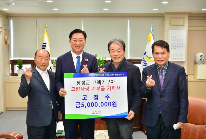 [전남=프레스뉴스] 차윤기 기자= 전남 장성군이 출향 기업인의 고향사랑기부제 동참 소식을 전했다. 군에 따르면, 장성군 삼계면 출신 고정주 ㈜나영산업 회장이 6일 고향사랑기부제 연간 상한액인 500만 원을 기탁했다.