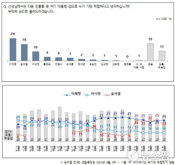 이와 관련해 엄경영 시대정신연구소장은 "윤 전 총장의 지지율이 재보선에서 선전한 오 시장 등 야권 주자들에게 일부 향한 것"이라며 "재보선 국면에서 윤 전 총장에 대한 언론 주목도가 떨어진 이유도 있다"고 설명했다.