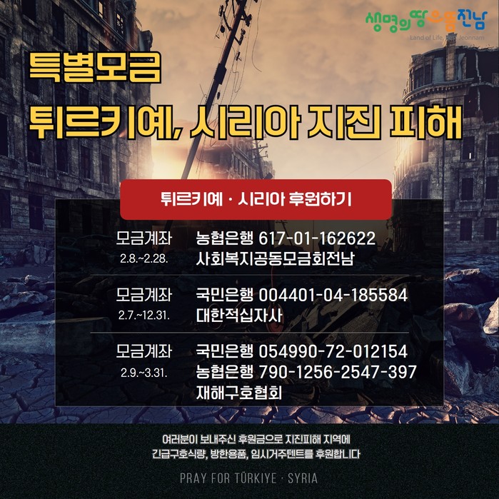 전남도는 강진으로 고통받는 튀르키예의 조속한 복구를 위해 지난 9일 예비비 10만 달러를 대한적십자사에 기탁하기로 한데 이어 14일부터 직원들의 자발적 참여로 진행되는 모금 운동을 본청과 시군에서 펼치고 있다.