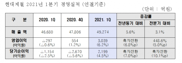 이날 현대제철의 발표에 따르면 연결기준 매출액은 전년 동기 대비 5.6% 증가한 4조9274억 원, 영업이익은 흑자전환하며 3039억 원을 기록했다. 영업이익률 또한 지난해 같은 기간 적자에서 벗어나 6.2%를 기록했다.