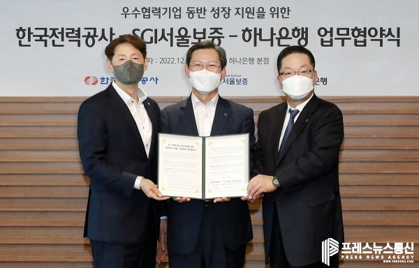 [프레스뉴스] 김대일 기자= 하나은행(은행장 박성호)은 을지로 본점에서 한국전력공사(대표이사 사장 정승일), SGI서울보증(대표이사 유광열)과 함께 중소기업과의 동반성장 지원을 위한 업무협약을 체결했다고 밝혔다.