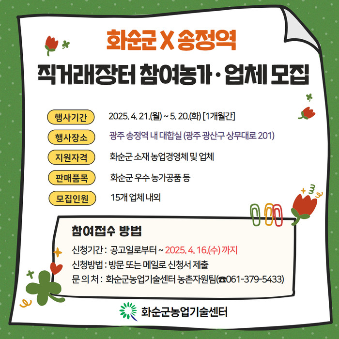 모집 대상은 화순군에 주소를 두고 농산물 가공품을 제조·판매하는 농업경영체이다. 신청 기간은 4월 8일부터 4월 16일까지이며, 신청서를 작성해 화순군 농업기술센터 농촌자원팀으로 방문하거나 이메일로 제출하면 된다.