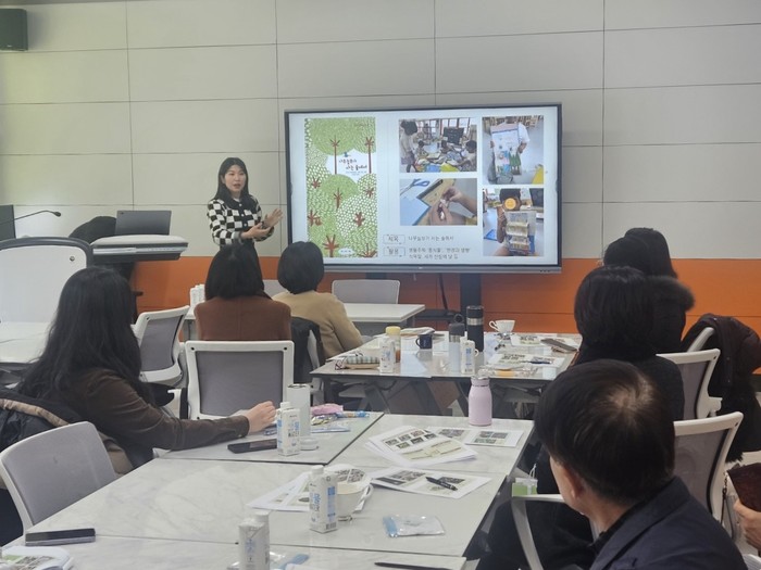 유치원 생태환경교육 강의를 맡은 박가은 강사(보성남초병설유치원)는 사계절의 변화를 주제로 체험과 놀이, 생태 관련 책과 연계한 교육과정을 공유해 연수생들에게 큰 호응을 받았다.