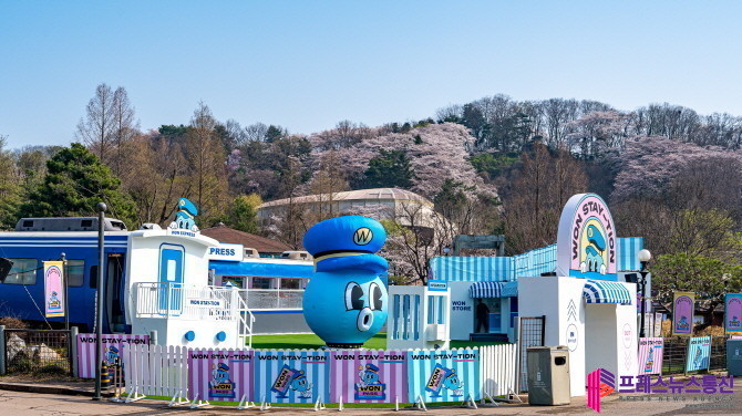 「WON STAY-TION」의 랜드마크인 중앙의 대형 캐릭터 벌룬, 포토부스, 굿즈샵, 휴게공간은 우리은행을 상징하는 블루색과 봄에 어울리는 핑크색으로 트렌디하게 연출되어 다양하고 재미있는 체험도 할 수 있게 구성됐다.