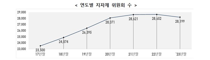 이에 따라, 지난 5년 동안 연도별 평균 1030개씩(연평균 4.0%) 큰 폭으로 증가하던 지자체 위원회 수가 지난해 위원회 정비 이후 2022년 말 2만 8652개에서 지난해 말 2만 8199개로 453개 감소했다.
