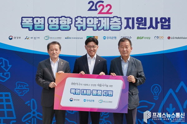 [프레스뉴스] 김대일 기자= 우리은행(은행장 이원덕)은 22일 여름철 폭염에 취약한 기후위기 취약계층 지원을 위해 충남 아산시청에서 환경부와 한국기후‧환경네트워크, 한국환경산업기술원, 현대백화점, BGF리테일 등 정부와 시민단체, 기업이 함께하는 폭염대응 물품 전달식을 가졌다고 23일 밝혔다.