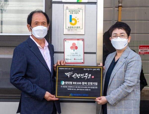 [프레스뉴스] 최정현 기자= 대전 대덕구는 20일 ㈜신탄진주조(대표 유황철)와 ‘대덕형 RE100’ 1호기업과 협약을 맺고 신재생에너지 확대를 통한 탄소중립 2050 달성을 위한 첫 발을 내딛었다.