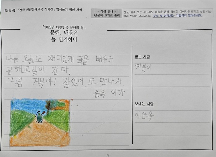 엽서쓰기 부문에서는 금암마을 이순옥 씨의 작품 ‘안녕! 거북아’가 국가평생교육진흥원장상(글꽃상)을 차지했다.