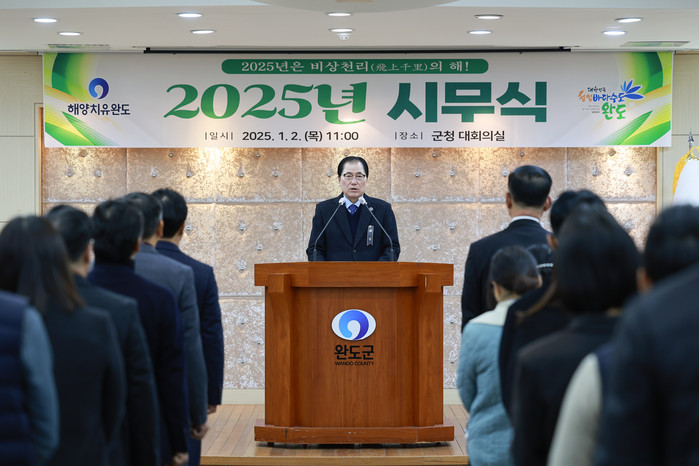 [전남=프레스뉴스] 박정호 기자= 신우철 완도군수는 1월 2일 시무식에서 신년사를 통해 신년 화두를 “하늘 높이 날아올라 더 큰 세상으로 도약한다는 뜻의 비상천리(飛上千里)로 정했다”면서 “그동안의 성과를 바탕으로 군이 국내를 넘어 세계로 비상할 수 있도록 최선을 다해 군정을 이끌겠다”라고 밝혔다.