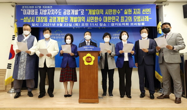 [프레스뉴스] 김대일 기자= 김명원 의원(더불어민주당, 부천6)을 비롯한 67명의 도의원(이하 ‘김의원 등’ 이라 함)은 23일(목) 경기도의회 3층 브리핑룸에서 최근 논란이 되고 있는 이재명 도지사가 성남시장 재임시절 대장동 공영개발 의혹과 관련하여 기자회견을 가졌다.