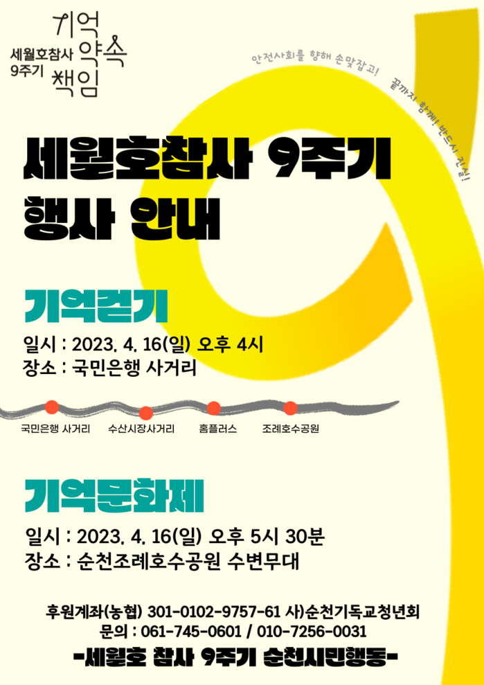[전남=프레스뉴스] 강래성 기자= 세월호 참사 9주기 순천시민행동은 “세월호 참사 아홉 번째 봄을 맞아 순천 시민 모두가 연대를 통해 그날의 아픔을 잊지 않고 기억하는 추모의 장을 마련하기 위해 기억 걷기, 기억문화제를 개최한다고 밝혔다.