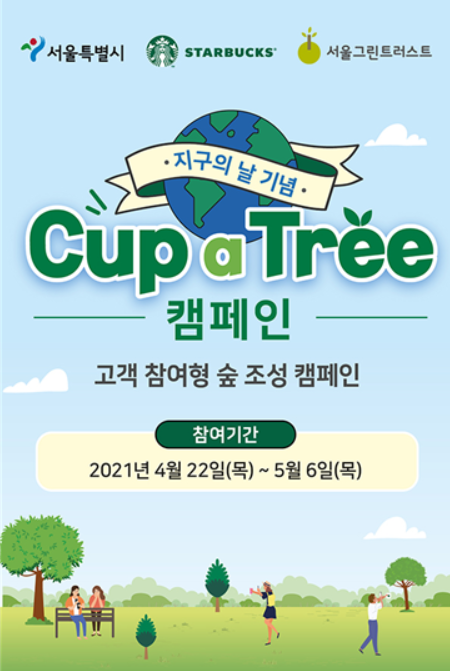 [프레스뉴스] 김대일 기자= 서울특별시는 스타벅스·서울그린트러스트와 함께 4월 지구의 날(4월 22일)부터 다음달 6일까지 시민참여형 친환경 캠페인인 ‘cup a tree(나무품은컵)’를 추진하여 우리 주변의 환경과 공원녹지의 의미를 되새겨본다.
