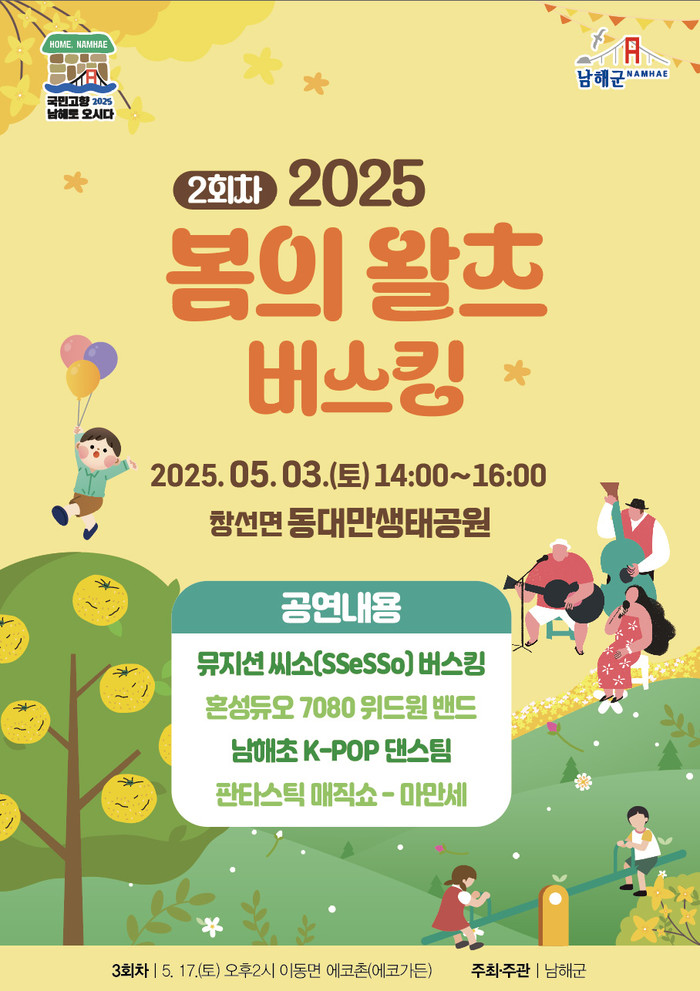 [프레스뉴스] 정재학 기자=남해군은 오는 5월 3일 오후 2시 창선면 동대만 생태공원에서 ‘2025년 제2회 봄의 왈츠 버스킹’ 공연을 개최한다.