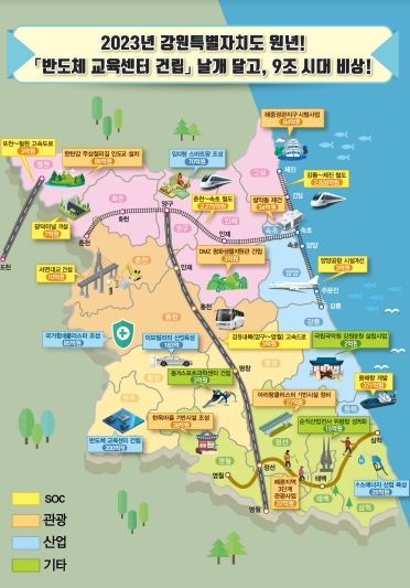 2023년 국회 예산심사 단계에서 반영된 강원도 핵심 사업에 대해 먼저 살펴보면, 민선 8기 새로운 강원도정의 최대 역점 사업인 반도체 클러스터 조성에 있어 핵심 역할을 하게 될‘공유형 반도체 교육센터 건립’사업에 국비 200억 원을 신규 확보했다.