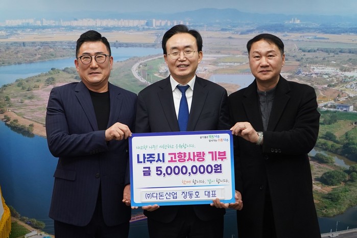 [전남=프레스뉴스] 강래성 기자= 전라남도 나주시(시장 윤병태)는 최근 리드팜스(주), 나영환경, ㈜다돈산업이 각각 500만 원씩, 총 1500만 원의 고향사랑기부금을 기탁했다고 11일 밝혔다.