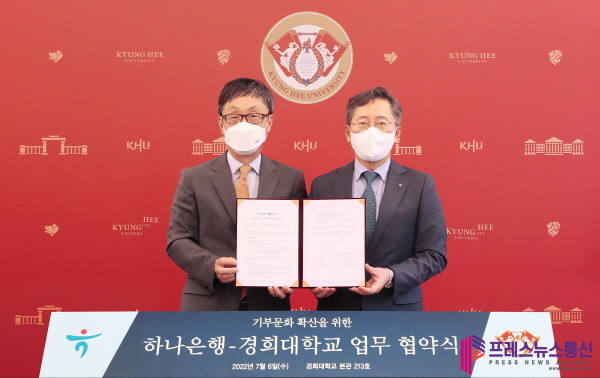 [프레스뉴스] 김대일 기자= 하나은행(은행장 박성호)은 경희대학교(총장 한균태)와 경희대학교 본관에서 「신탁을 통한 유산기부 문화 활성화」를 위한 업무협약을 체결했다고 밝혔다.