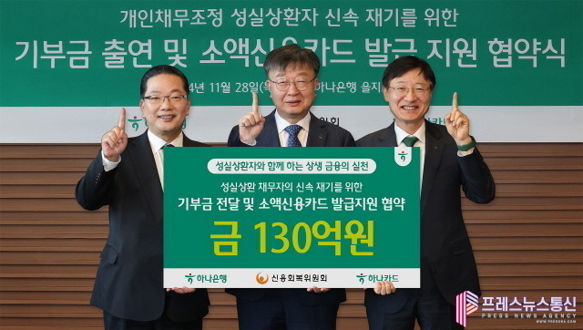 [프레스뉴스] 류현주 기자= 하나은행(은행장 이승열)과 하나카드(대표이사 이호성)는 28일 신용회복위원회(위원장 이재연)와 『개인채무조정 성실상환자를 위한 기부금 출연 및 소액 신용카드 발급 지원』에 관한 업무협약을 맺고 채무조정 성실상환자의 신용회복 및 재기 지원에 적극 나선다고 밝혔다.