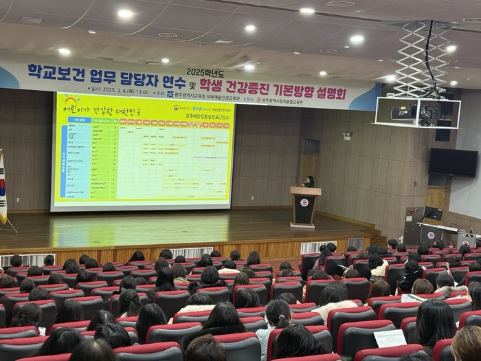 [광주=프레스뉴스] 강래성 기자= 광주시교육청(교육감 이정선)은 6일 광주창의융합교육원 대강당에서 학교와 교육지원청에서 근무하는 학교보건업무 담당자를 대상으로 ‘2025학년도 학교보건 업무 담당자 연수 및 학생 건강증진 기본 방향 설명회’를 개최했다.