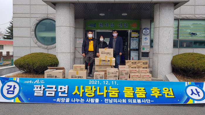 전남의사회 의료봉사단에서 당초 농사일에 지친 팔금면 주민들에게 영양제 링거 의료봉사를 계획하였으나 코로나19 확산으로 인하여 희망을 나누는 사람들과 함께 지팡이, 파스, 마스크, 생필품 등을 지원하기로 결정하고, 이를 팔금면여성단체협의회(회장 이정심)를 통해 관내 저소득 주민들에게 신속하게 전달하기로 하였다.