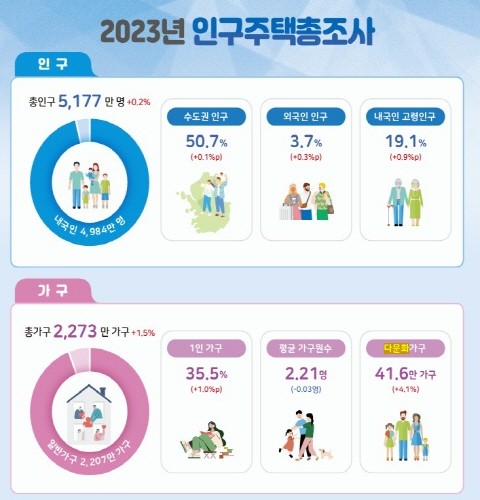 통계청이 29일 발표한 '2023년 인구주택총조사(전수) 결과'에 따르면 지난해 11월 1일 기준 우리나라 총인구는 5177만 5000명으로 전년보다 8만 2000명(0.2%) 증가했다.
