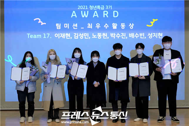 | ▲ 2021 청년특급 3기 수료식-팀미션으로 최우수 활동상을 수상한 17조가 기념촬영을 하고 있다.(사진=경기도주식회사) |