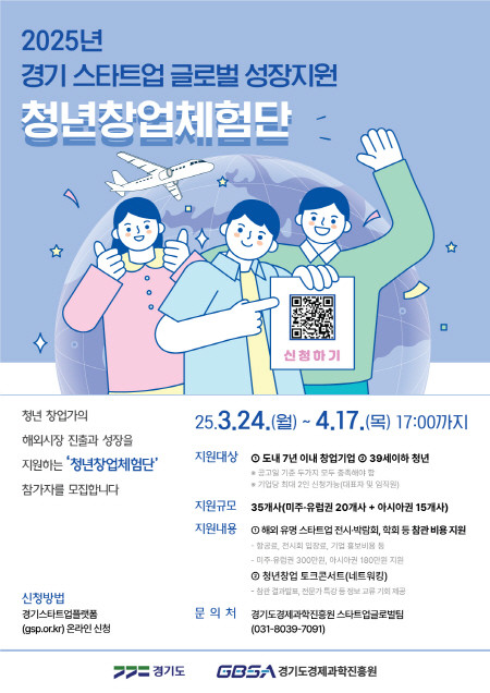 | ▲2025년 경기 스타트업 글로벌 성장지원 청년창업체험단 모집 포스터(사진=경기도) |