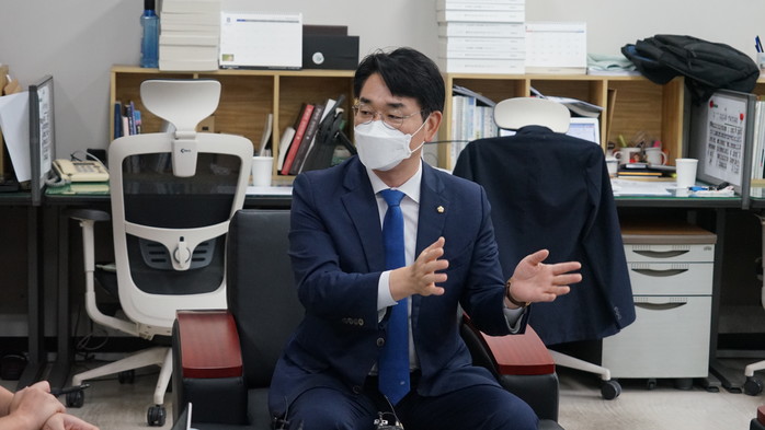 ▲ 민주당 박용진 대선 후보가 충북도청에서 기자 간담회를 하고 있다. |
