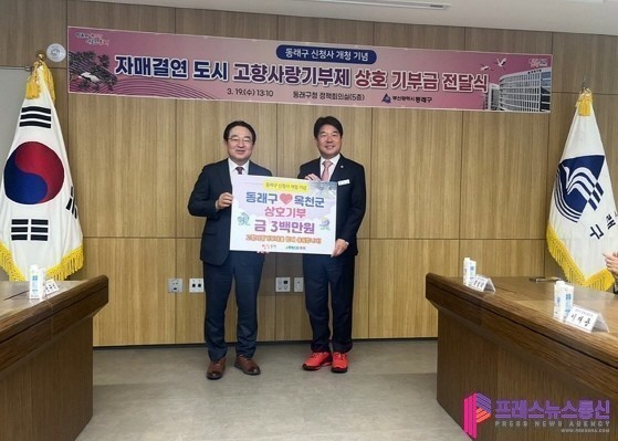 [프레스뉴스] 류현주 기자= 충북 옥천군(군수 황규철)과 부산광역시 동래구(구청장 장준용)가 고향사랑기부제 활성화 등 자매도시 협력 강화를 논의하고자 19일 부산 동래구청에서 만났다.