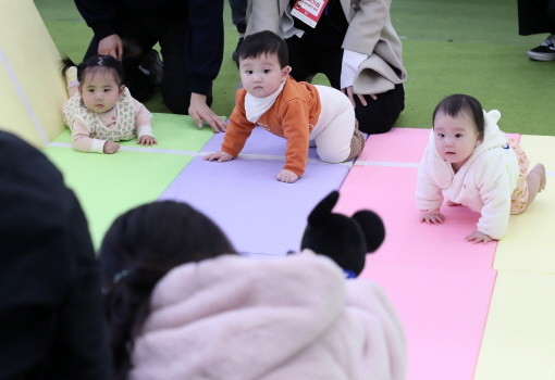 | ▲지난 3월 7일 대구 북구 엑스코에서 개막한 '제39회 대구베이비&키즈페어(대구베키)'의 부대행사로 열린 생후 12개월 이하 아기들의 경주 '컴 온 베이비(come on baby)' 이벤트에 출전한 아기들이 아빠·엄마의 손짓을 바라보며 결승선을 향해 다가가고 있다.(사진= 뉴스1) |