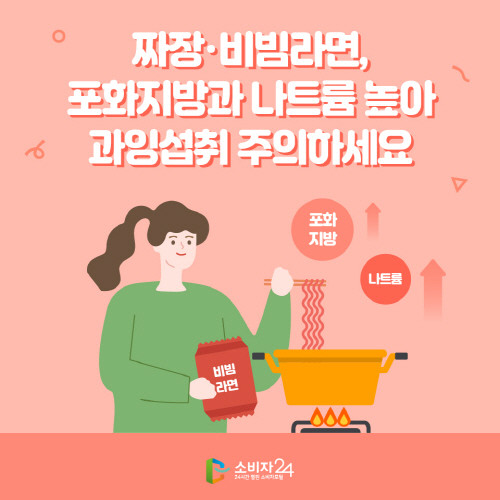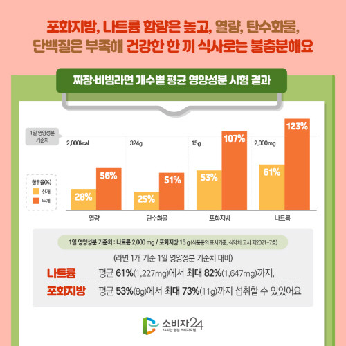 시험 결과, 짜장‧비빔라면의 대장균군, 이물 등 안전성은 문제가 없었지만 평균 포화지방 함량은 1일 영양성분 기준치(15g)의 53%, 나트륨(2,000mg)은 61%로 상대적으로 높았다. 특히 한 번에 두 개를 먹을 경우 1일 기준치를 초과한 포화지방과 나트륨을 섭취할 수 있어 주의가 필요하다. 매운맛 등의 맛 특성과 씹힘성 등 면의 특성은 제품별로 차이가 있었고, 일부 제품은 나트륨 함량 및 온라인 제품정보 표시의 개선이 필요하다.