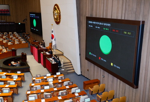 | ▲14일 오후 서울 여의도 국회에서 열린 제422회국회(임시회) 제6차 본회의에서 헌법재판소 재판관 마은혁 임명 촉구 결의안(대안)이 통과되고 있다.(사진= 뉴스1) |