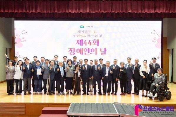 | ▲18일 오전 경기종합노동복지회관에서 열린 제44회 경기도 장애인의 날 기념식에서 김동연 경기도지사, 경기도 장애인단체연합회, (사)경기도 장애인복지단체연합회, 경기도의회 의원 등 참석자들이 기념촬영을 하고 있다.(사진=경기도) |