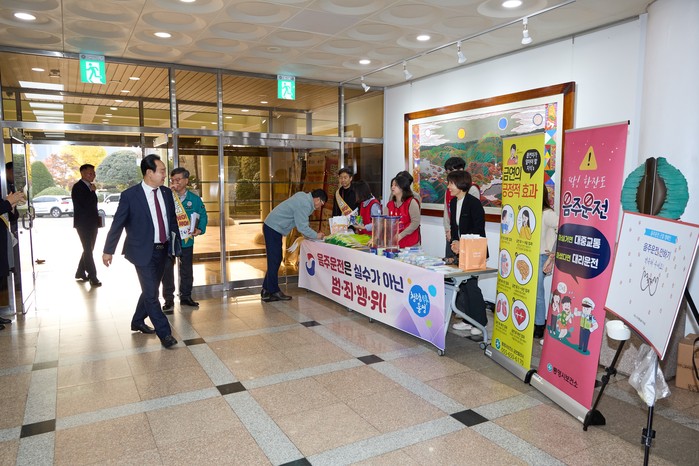 출근하는 직원들을 대상으로 1‧2청사 현관에서 ‘음주운전 NO! NO!’, ‘청렴은 의무, 실천은 의지’라는 슬로건 아래 실시한 이번 캠페인은 음주운전 및 음주와 관련된 사회적 폐해에 대해 홍보하고 음주운전의 근절 의지 다짐을 위한 것이다.