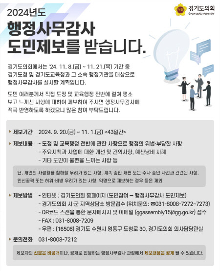[프레스뉴스] 류현주 기자= 경기도의회(의장 김진경)는 2024년도 행정사무감사(11.8.~11.21.)의 내실을 기하고 도민참여와 소통을 위해 9월 20일부터 11월 1일까지 도민제보 창구를 운영한다.