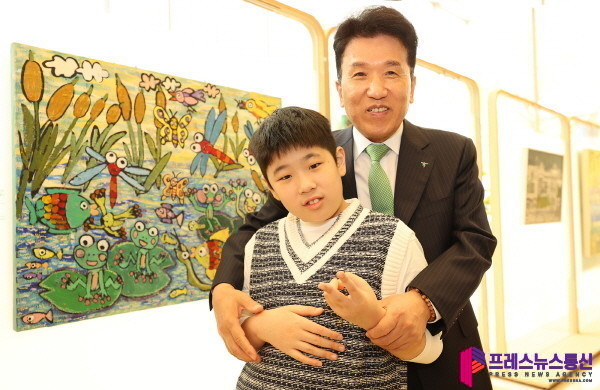 ▲함영주 하나금융그룹 회장(사진 오른쪽)이 17일 아동·청소년부문 우수상 수상작인 이도원 작가의 '연못마을 개구리와 친구들' 작품 앞에서 이도원 작가와 함께 기념 촬영을 하고 있다.(사진=하나금융그룹) |
