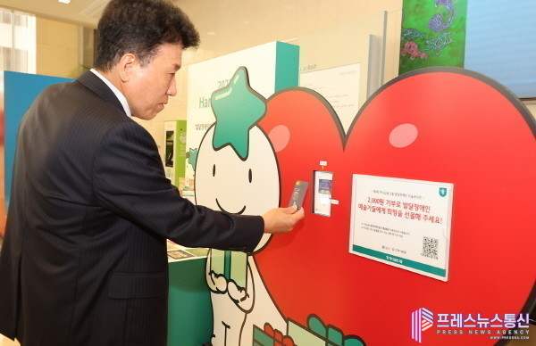 ▲함영주 하나금융그룹 회장이 카드결제 방식으로 기부할 수 있는 '기부 키오스크'를 통해 발달장애 예술가들에게 따뜻한 마음을 전달하고 있다.(사진=하나금융그룹) |
