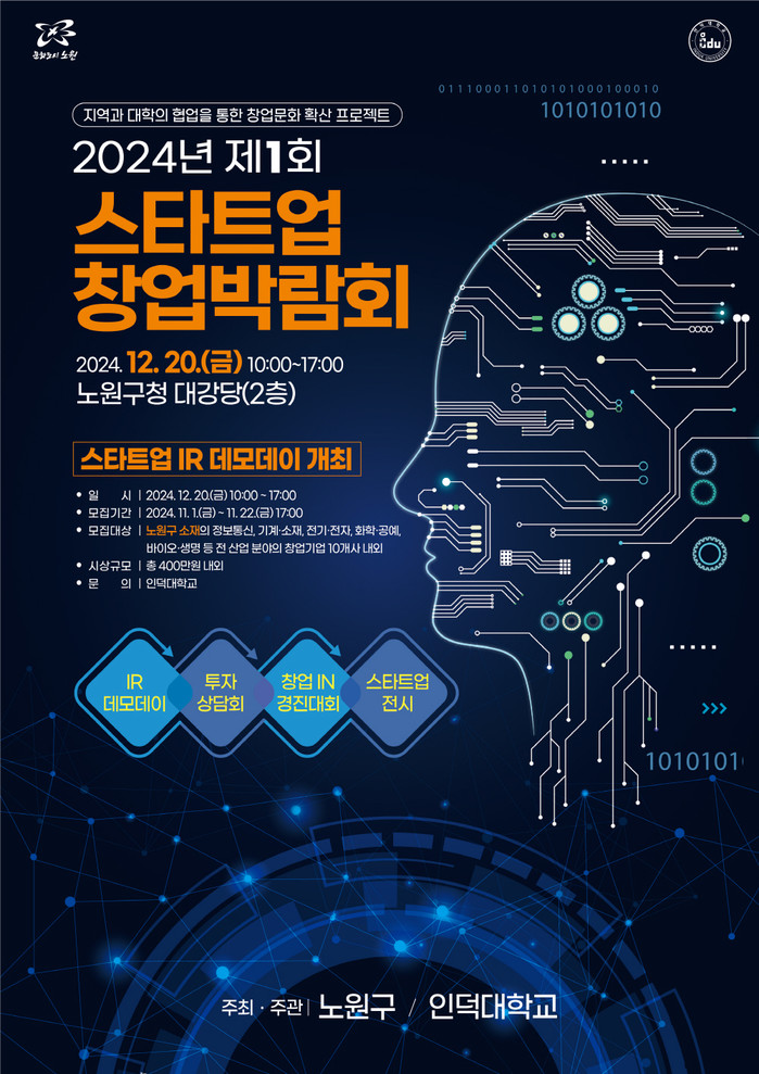 서울시 노원구와 인덕대학교는 오는 12월 20일 ‘2024년 제1회 스타트업 창업 박람회’를 개최, 참여 기업을 모집한다고 밝혔다.