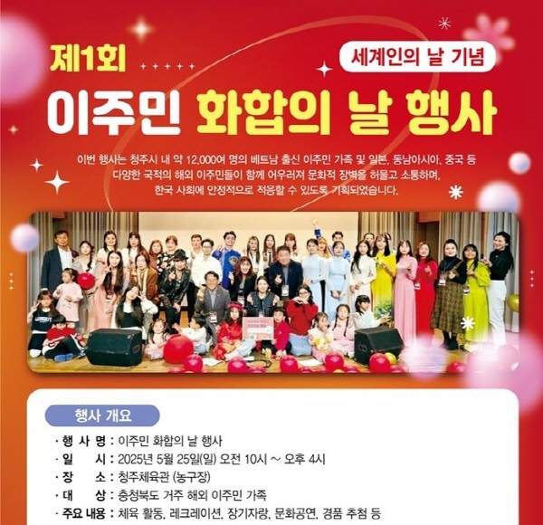 행사에는 충북도와 청주시의 주요 내외빈 인사들의 축사, 공군 군악대 공연, 경품 추첨 등 다양한 순서가 마련되어 있다. 점심시간에는 다문화 음식 부스와 후원 협찬업체 홍보 부스가 운영되어 참가자들에게 풍성한 먹거리와 체험의 장을 제공한다.