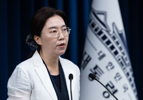 ▲강유정 대통령실 대변인이 14일 서울 용산 대통령실 청사에서 국민임명식 및 외빈 만찬 관련 브리핑을 하고 있다.(사진= 뉴스1) |