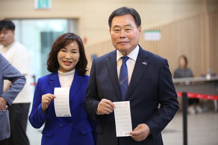 [전남=프레스뉴스] 강래성 기자= 김산 무안군수는 제21대 대통령 선거 사전투표 첫날인 29일, 부인 장예운 여사와 함께 무안읍 승달문화예술회관에 마련된 사전투표소를 찾아 군민들과 함께 소중한 한 표를 행사했다.