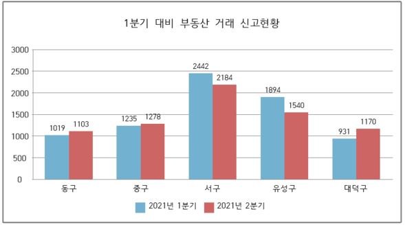 자치구별 1분기 대비 거래량을 살펴보면, 투기과열지구인 유성구와 서구는 각각 18.7%, 10.6% 감소한 반면 대덕구는 20.5%나 증가했고, 동구와 중구도 각각 8.2%, 3.5% 증가했다.