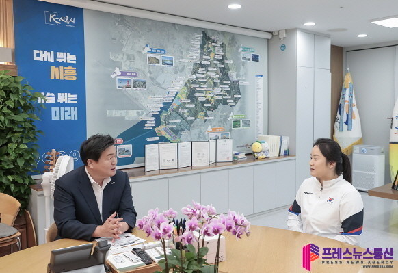 | ▲임병택 시흥시장이 지난 11일 시장실에서 ‘2024 제17회 파리 패럴림픽’ 배드민턴 국가대표로 출전한 권현아 선수에게 격려금을 전달하며 응원의 시간을 가졌다.(사진=시흥시) |