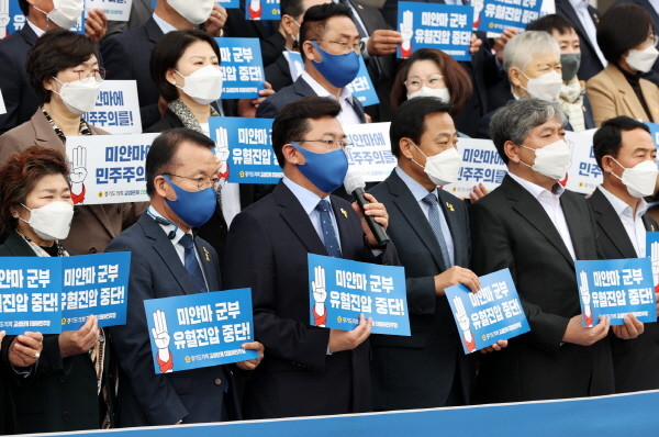 더불어민주당 의원들은 ‘미얀마 군부 유혈진압 중단’,‘미얀마에 민주주의를’이 적힌 손 피켓을 들고 미얀마 군부의 폭력 및 유혈 진압 중단 및 미얀마 민주주의 회복을 촉구했다.